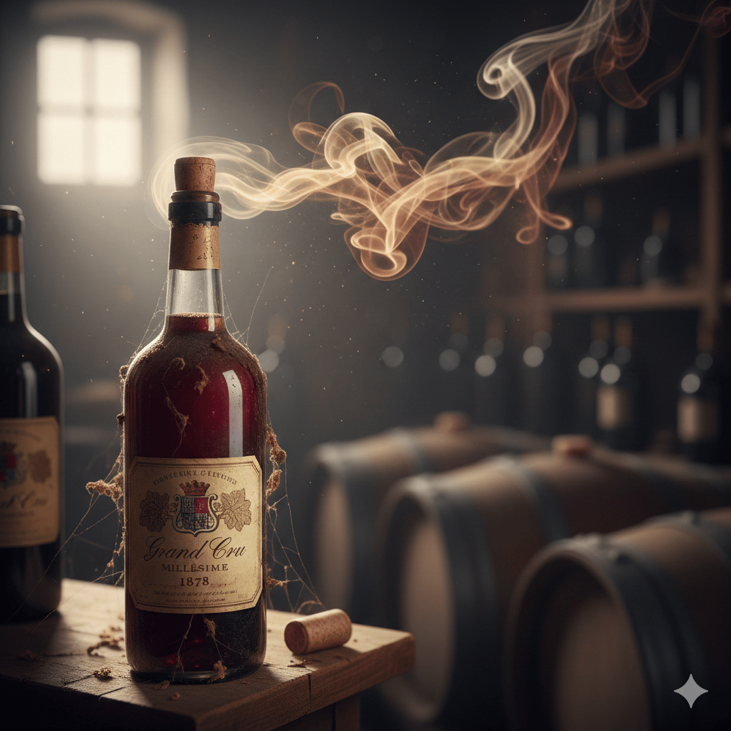 Dan de aroma's. Als rode wijn oud wordt, gebeurt er dit: de tannine wordt zachter en fijner, je krijgt aroma's zoals: bosgrond, aarde, champignons, herfstige tonen, wild vlees en lavas. Als de wijn te oud is heb je dit: maggi, azijn, bouillonblokje en sherry achtige tonen. De wijn is dan helemaal "geöxideerd" (zo noemen we dat).
