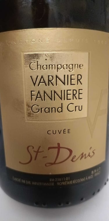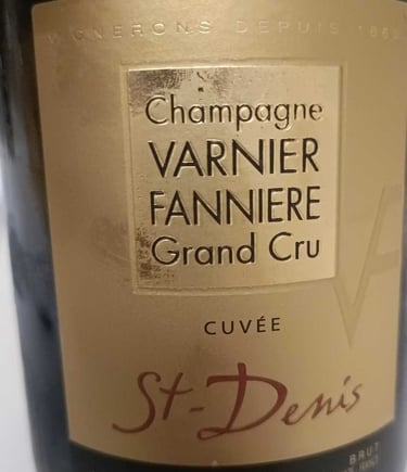 1. Champagne Varnier Fannière Grand Cru Cuvée St-Denis Brut. Tirage 2020 (=botteling en start rijping), Dégorgement 2025. 100% Chardonnay.