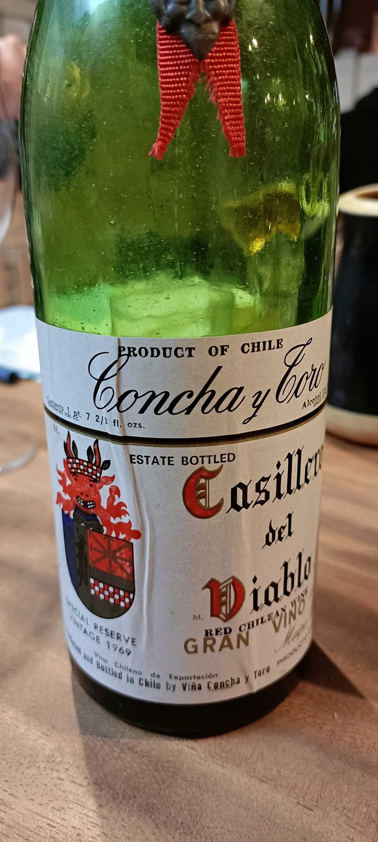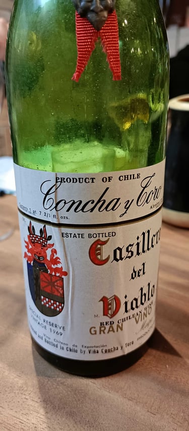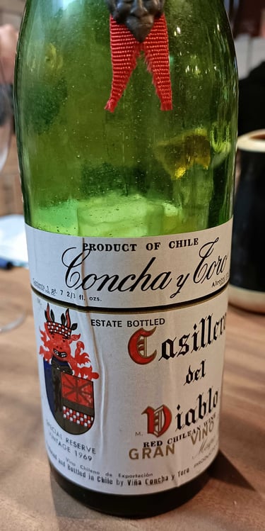 Ja, en dan de Casillero del Diablo (foto). Ik dacht, waar ken ik dat toch van? Grappige is, die kun je gewoon bij de Appie kopen. Maar vroeger was dit echt een van de chiqueste Chileense rode wijnen. En ook werd er in die tijd bijzonder weinig geëxporteerd, dus het is een wonder dat deze parel ertussen zat. Sowieso heeft dit huis een bijzonder rijke geschiedenis. En hoe was 'ie? Bijzonder! Zeker een hoop leeftijd wat je terug proefde, maar ook nog tonen van zwart fruit in de verte aanwezig; een mooie complexe afdronk. Ik moet zeggen dat voor de leeftijd ik dit echt heel bijzonder vond. Ook ontwikkelde de wijn sterk in het glas. Na het opentrekken had de wijn lucht nodig. Na 5-10 minuten begon het aangenaam te worden. Toen zakte de wijn weer in. Na 30 minuten was hij op zijn top! Fruit zat er echt nog wel in en kwam er toen uit. Dit moet in die tijd echt een waanzinnige wijn geweest zijn in die tijd. Na een uur zakte de wijn weer in, maar goed, wat wil je voor een wijn van 56 jaar oud?