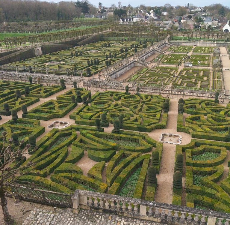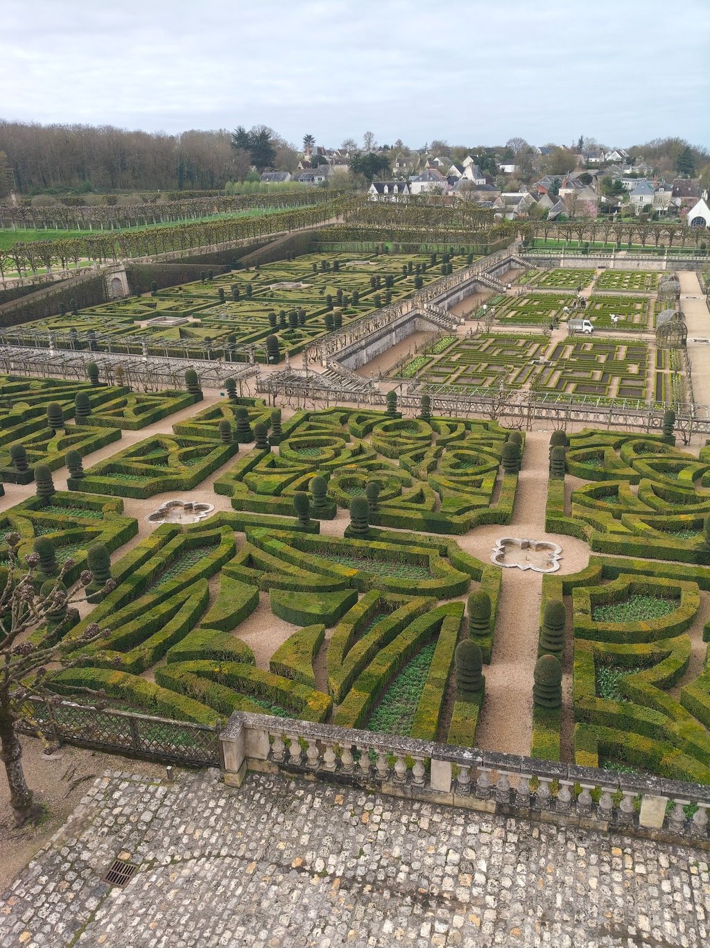 Op de foto zie je de Engelse tuinen van Château de Villandry. Een geometrische lust voor het oog. Het château zelf bestaat al sinds de 11/12e eeuw, maar is een aantal keer afgebroken en herbouwd. Nog enkele resten van die tijd staan overeind. In de renaissance is het deels herbouwd, maar ook later tijdens de 18e, 19e, en 20e eeuw is het meerdere keren veranderd. Elk van de nieuwe eigenaren heeft iets toegevoegd aan het château vanuit zijn eigen tijdsgeest. Wij hebben vooral de tuinen ("les jardins") bezocht. Die waren nog niet volledig in bloei, maar wel perfect aangeharkt en leuk om te bezoeken. De foto spreekt erg voor zich. Het is het leukste om dit een beetje van bovenaf te bekijken. Pas dan zie je de geometrische patronen echt goed.