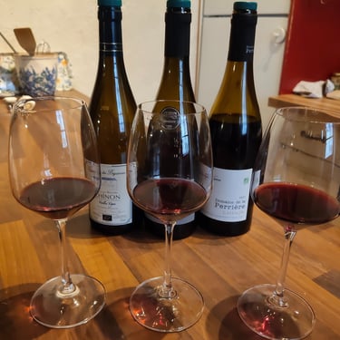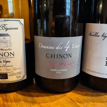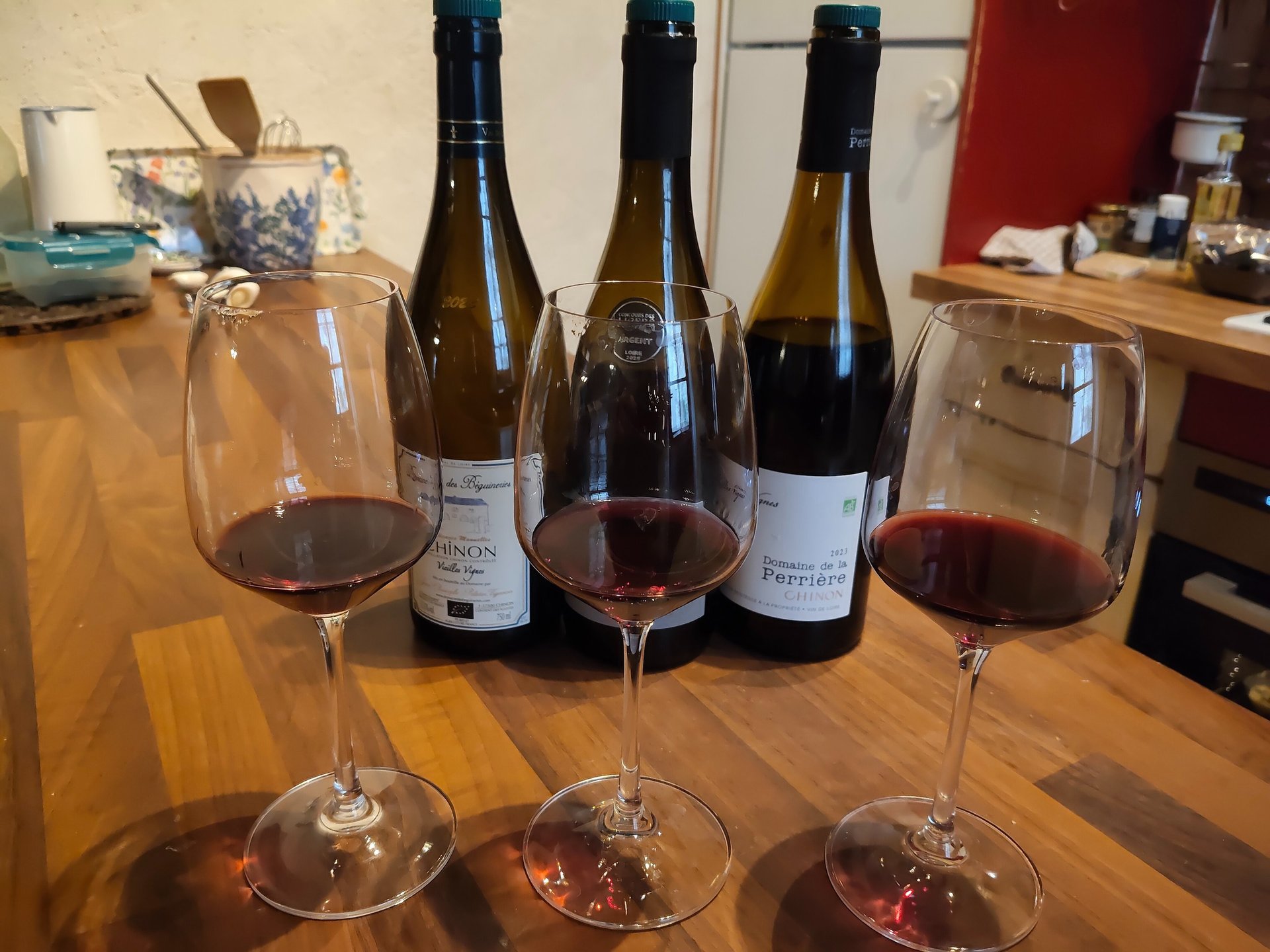 Het doet me ook altijd een beetje denken aan een Pinot Noir uit de Bourgogne of een Gamay (tip) uit de Beaujolais. Ik heb daarom met vriendin erbij een klein proeverijtje gedaan. Dit waren allen wijnen uit Chinon van oude wijnstokken -"vieilles vignes". Waarom is dat van belang? In principe geven oude stokken minder opbrengst, maar wel een hogere concentratie. Het is een soort kwaliteitsdingetje die wijnmakers graag vermelden op de fles. Let wel, dit is geen beschermde term om te gebruiken. De stokken kunnen 20 of 50 jaar oud zijn, dat weet je niet. Neem het dus met een kleine korrel zout.