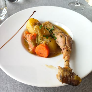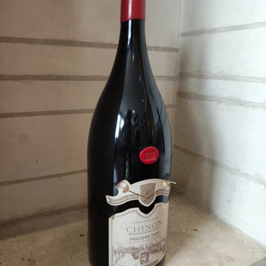 Ter begeleiding van de Chinon at ik in een restaurant om de hoek een stukje Parelhoen, zie foto. De fles van 5L ter plekke is een mooi decoratief naast de open haard in het restaurant. Die mocht prima aan bij het drinken van een mooi glas wijn.