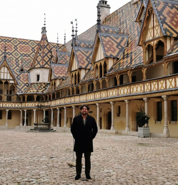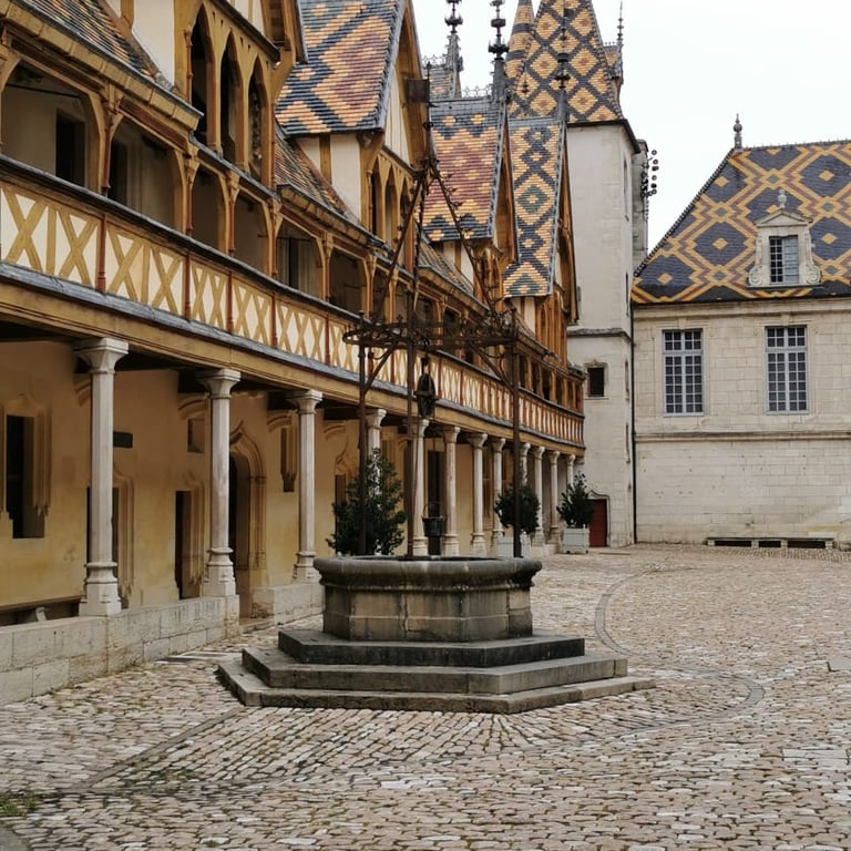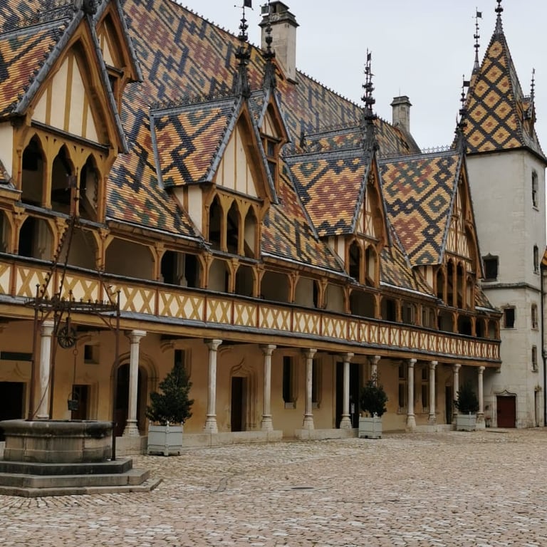 Je ziet de foto's, en je weet het meteen: dit is het Hospices de Beaune, ook bekend als het Hôtel-Dieu. Dit is een van de meest iconische monumenten van de Bourgogne. Het werd in 1443 gesticht als ziekenhuis voor de armen, in de nasleep van de Honderdjarige Oorlog. Het gebouw is beroemd om zijn kleurrijke terracotta dakpannen en prachtige gotische architectuur, die tot op de dag van vandaag bijzonder goed bewaard zijn gebleven. Overal door de stad zie je dan ook de motiefjes van het Hospice op de stenen bankjes. Ze hebben er echt hun stadse trots van gemaakt. Mooi man!